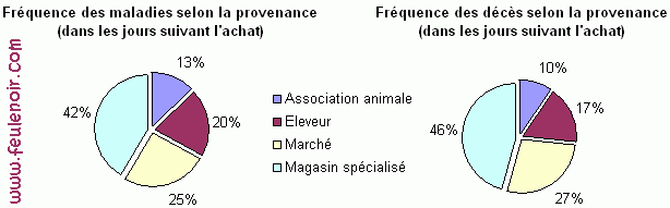 La fréquence des maladies et des décès dans les jours suivant l’achat dépassent les 40% lorsque l’animal provient d’un magasin spécialisé mais ces chiffres chutent de moitiés (<20%) s’il le vendeur est un éleveur professionnel. L’achat sur les marchés (par des particuliers ?) occupe une place intermédiaire avec 25 à 27% de risques et les associations remportent la palme avec moins de 13%.